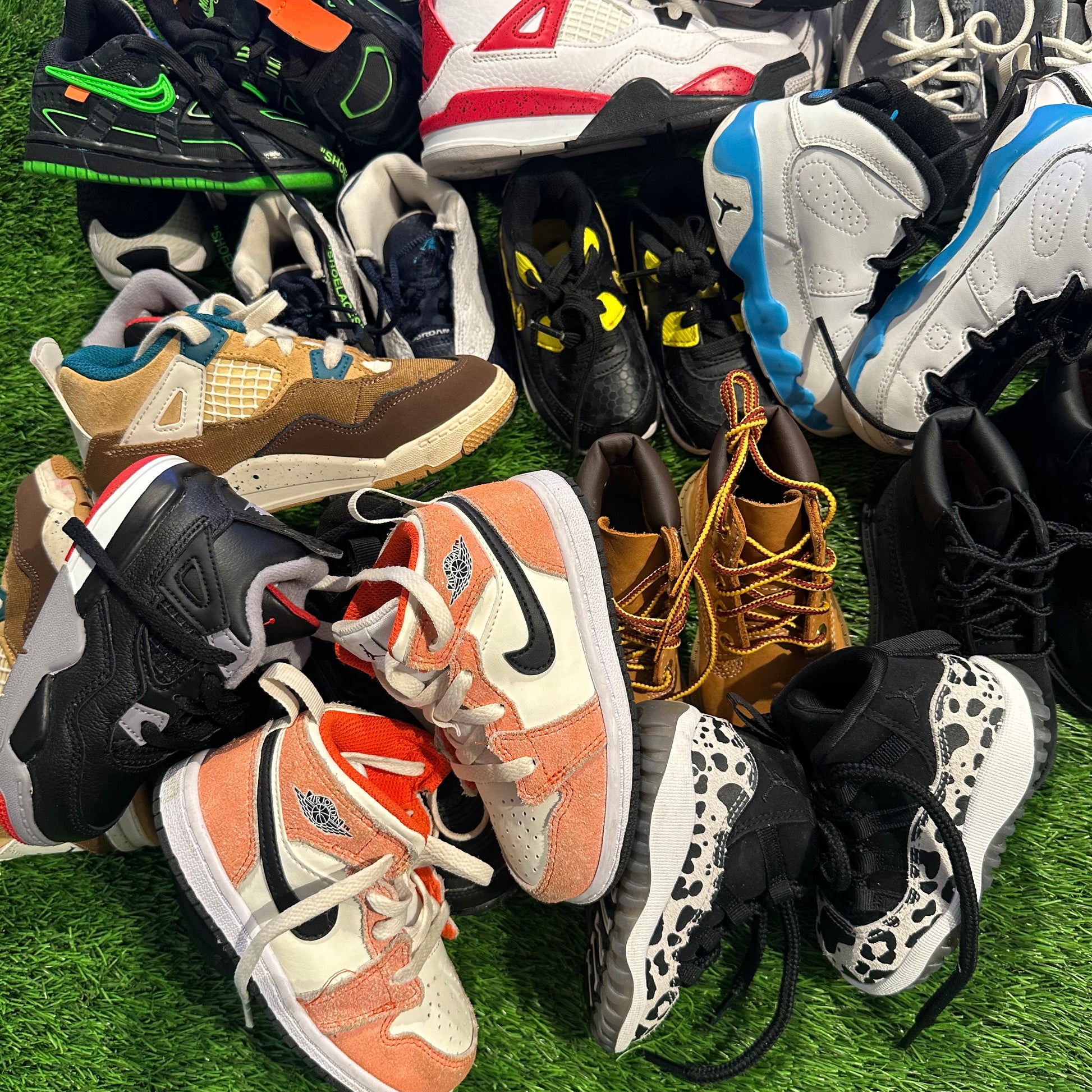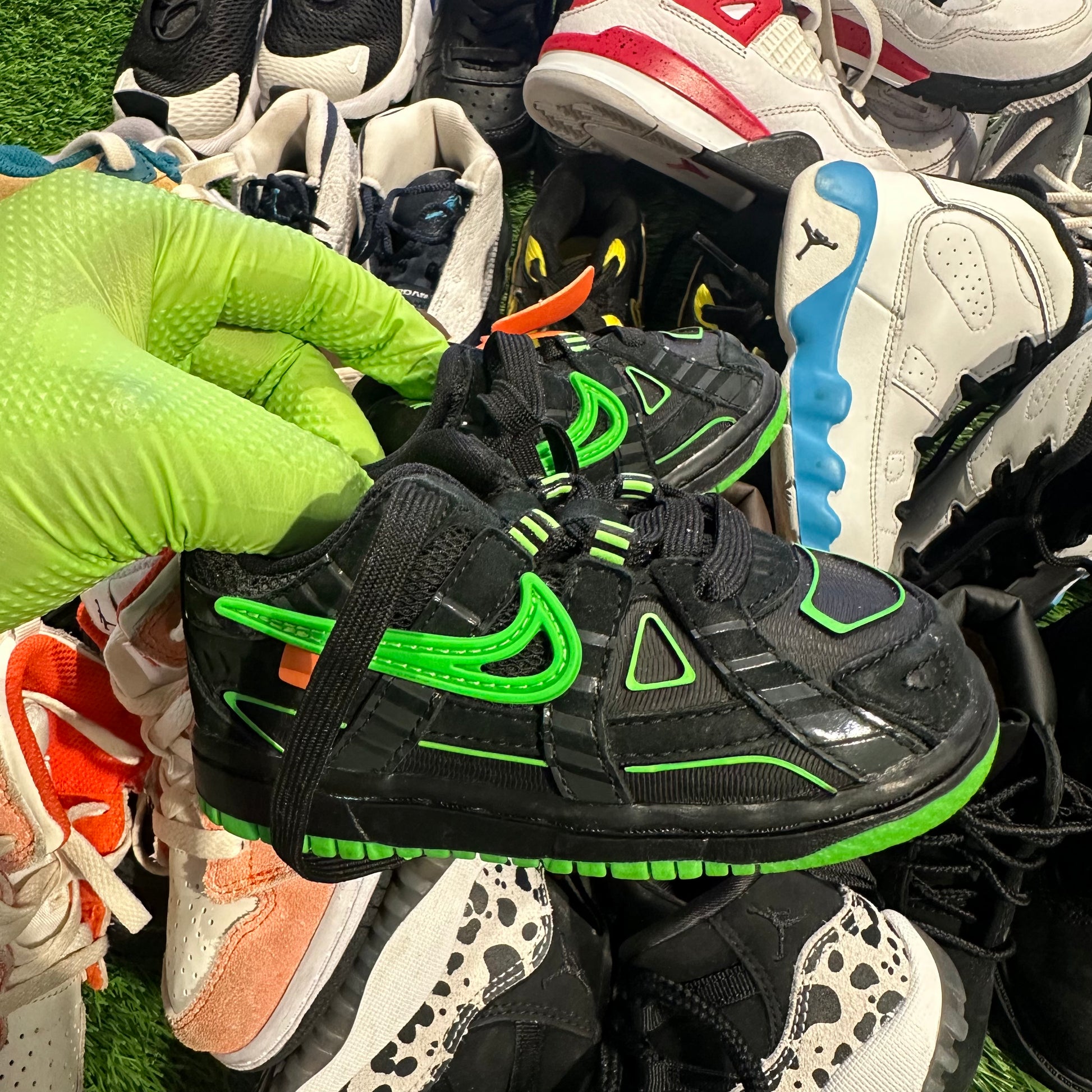 Nike Air Rubber DunkOff-White Green Strike (TD) size 6: https://stockx.com/nike-air-rubber-dunk-off-white-green-strike-td?country=US¤cyCode=USD&size=6